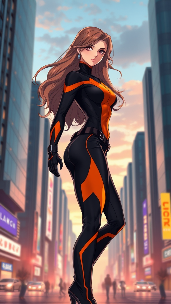 A female superhero stands tall in a bustling big city, her long, wavy hair cascading down her back. She wears a sleek black and orange suit that accentuates her agility and strength. In a full-body, dynamic pose, she exudes confidence and power. The scene is bathed in volumetric lighting with soft shadows, capturing the serene beauty of dusk. The environment reflects the cinematic style of Studio Trigger, Makoto Shinkai, and Studio Ghibli, with an anime flair that brings a sense of wonder and excitement. The city's skyline is drawn with precision and clarity, emphasizing the superhero's presence against the backdrop. Her expression is one of determination, embodying the spirit of a guardian ready to protect and inspire. The quality is vivid and sharp, reminiscent of high-resolution art found on platforms like ArtStation, ensuring every detail is perfectly captured.