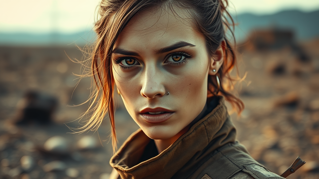 A female survivor stands in a rugged, desolate wasteland, clad in a well-worn fallout suit. Her gaze meets the viewer with an intense seriousness, set against an apocalyptic backdrop. The portrait captures intricate details of her skin, with a hyper-realistic quality and natural imperfections to enhance authenticity. Her face, framed by strands of wind-tousled hair, features a small piercing above her brow. The scene is expertly crafted with diffused soft lighting, creating a warm, cinematic glow, while a shallow depth of field keeps her sharply in focus against the blurred, chaotic surroundings. This 8k, highly-detailed image employs high detail RAW color art, capturing every nuance of her expression and the textured fabric of her suit. The composition remains strikingly clear, free from low-quality elements like jpeg artifacts or unwarranted digital distortions, celebrating the human form without textual distractions. This portrait engages in a narrative of resilience and solitude, drawing viewers into its immersive visual storytelling.