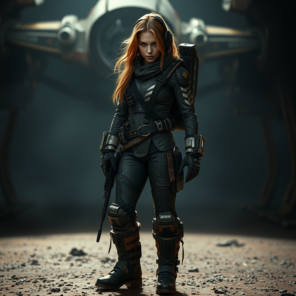 A female X-wing pilot clad in a sleek, futuristic space suit with rugged boots, ready for action. Her outfit is detailed with intricate warcore elements and a stark, bold style. The setting is hyper-realistic with cinematic lighting that casts dramatic shadows, lending an epic fantasy feel to the scene. Her expression is intense and focused, embodying a harsh, determined look. The image captures a grainy, graphic quality, rich in detail, and evokes a sense of a high-stakes interstellar mission, rendered in striking 8k resolution, with a 16:9 aspect ratio, blending realism with imaginative flair.