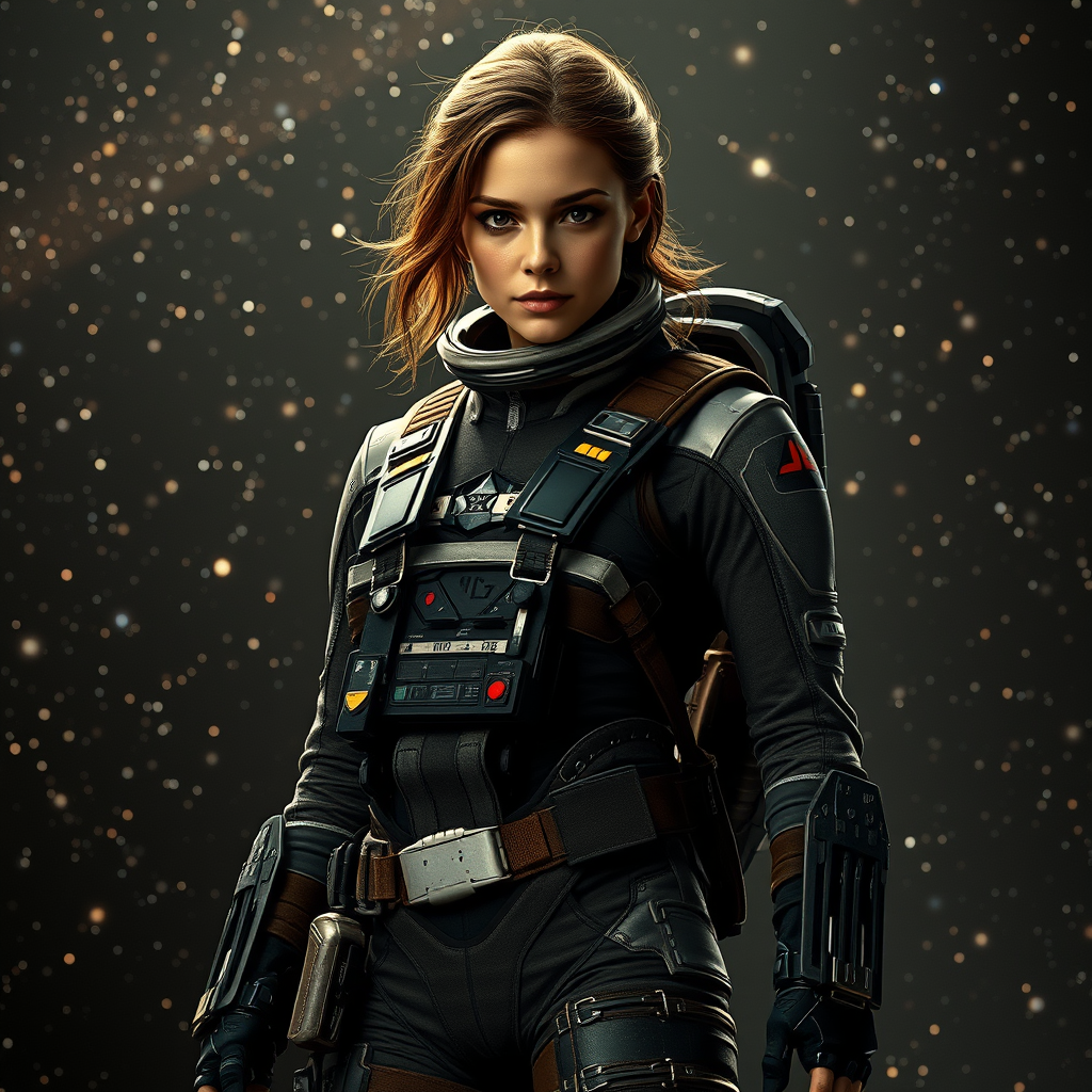 A female X-wing pilot wearing a sleek, futuristic space suit complete with rugged boots, set against the backdrop of a star-filled universe. Her expression is focused and determined, embodying the essence of a war-hardened hero. The cinematic lighting casts dramatic shadows across her suit, accentuating its advanced technology and intricate design. She stands amidst a scene that blends epic fantasy with hyper-realistic elements, where grainy textures add depth to the visual, enhancing her fierce and commanding presence. The vivid details of her gear and the harshness of her gaze convey an epic sense of readiness for the challenges of interstellar combat, all captured in stunning 8k clarity with a striking 16:9 aspect ratio.