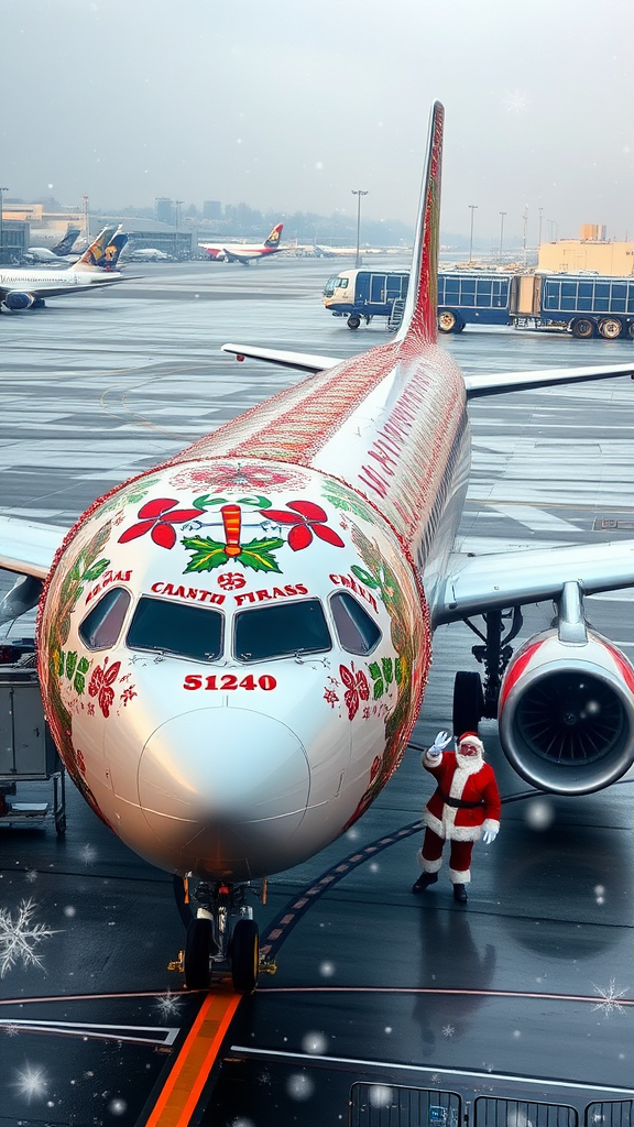 A festive Airbus A320 adorned with intricate Christmas decorations sits on the tarmac of a bustling airport, its exterior gleaming with colorful lights and holiday-themed artwork. Nearby, Santa Claus himself waves cheerfully, standing amidst a swirl of snowflakes, surrounded by the glittering warmth of the holiday spirit.