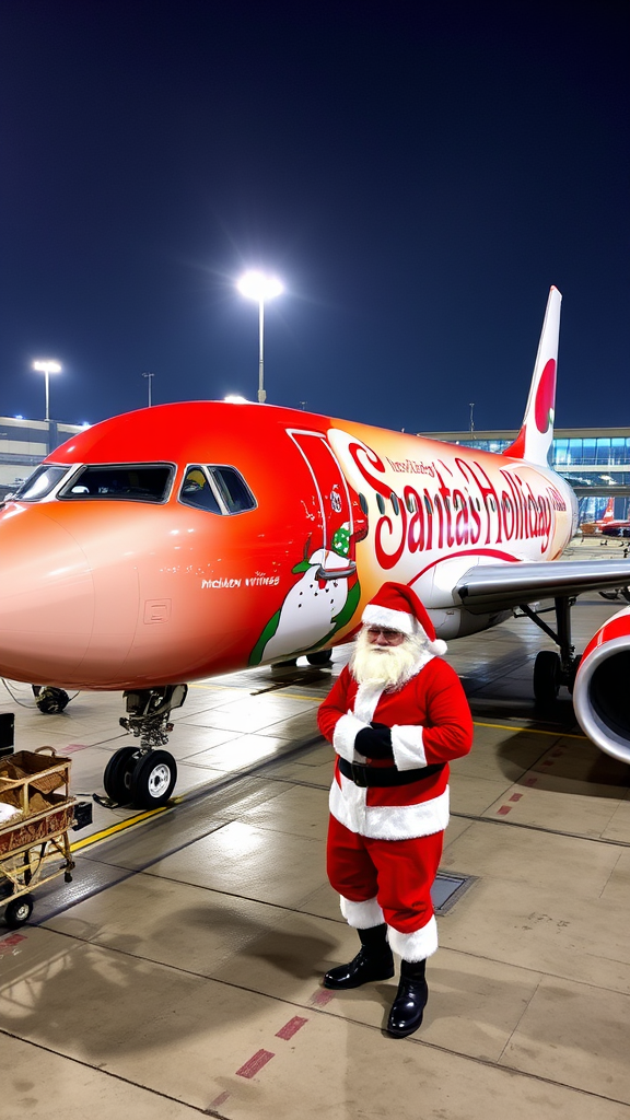 A festive Airbus A320 airliner from Santa's Holiday Wings showcases its special Christmas-themed livery at the bustling airport, complete with twinkling lights and jolly Santa Claus art along the fuselage. Amidst the holiday cheer, Santa himself warmly greets travelers on the tarmac, spreading joy and excitement.