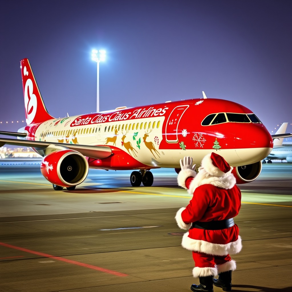 A festively adorned Airbus A320 from Santa Claus Airlines rests on the tarmac, gleaming with vibrant Christmas decorations that depict reindeer, snowflakes, and holly along its fuselage. Nearby, Santa Claus himself stands on the ground, waving cheerfully as he surveys the enchanting scene, his iconic red suit contrasting against the wintery background of twinkling airport lights.