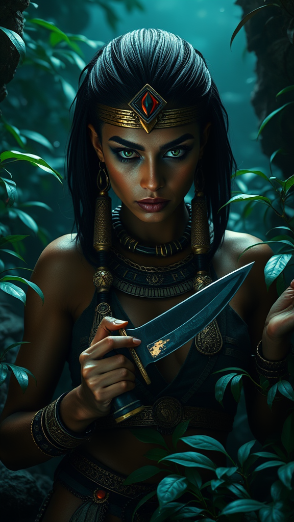 A fierce adult Egyptian woman with mesmerizing green eyes and sleek black hair styled into sharp flaps, adorned with intricate makeup. She stands confidently, her upper body facing the viewer, in an ancient Egyptian theme blended with a feral jungle warrior aesthetic. She wields an obsidian stone knife, surrounded by dense bushes and poisonous plants amidst scattered rocks, evoking a humid climate filled with mystery. The scene is set in a dark chamber, shrouded in dim light, creating a cinematic atmosphere reminiscent of a 1970s film. Her detailed face and the masterpiece composition are captured with high frequency details, evoking the texture of 35mm film and adding an element of film noise, reminiscent of an SAI Pixel Art style.