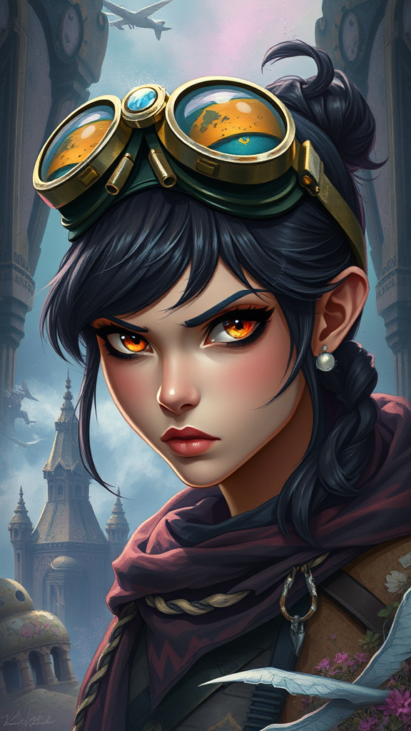 A fierce adventurer with goggles perched on her head, surrounded by mystical landscapes, illustrated in the style of Rudy Siswanto, blending elements of fantasy art and realism, her determined gaze capturing an air of mystery and strength, her features subtly enhanced with surreal, otherworldly details that evoke a sense of wonder and enchantment.