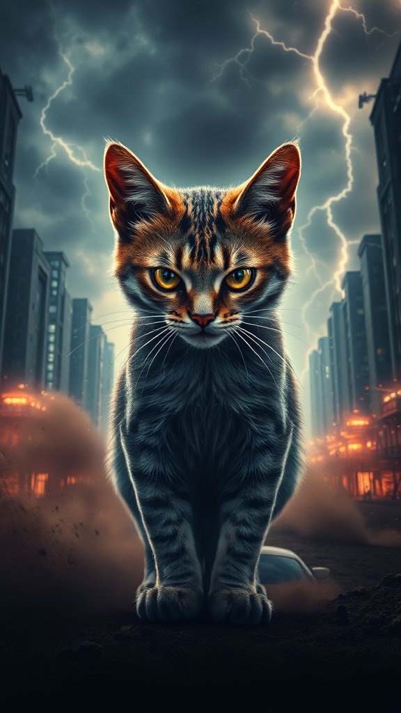 A fierce and badass feline with mesmerizing eyes stands poised amidst billowing dust, set against a stunning sci-fi cyberpunk backdrop of a stormy apocalyptic city. Sparks and lightning crackle around, highlighting the intricate details of the futuristic world. This scene captures the intense energy and raw power of an angry cat in a visually striking 4k movie poster photograph.