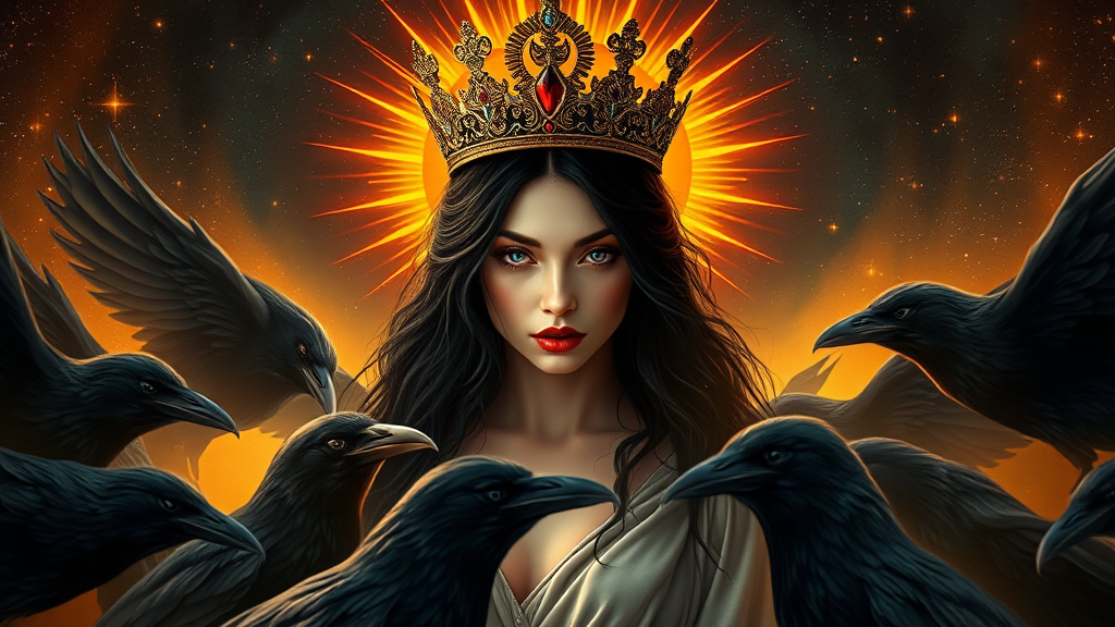 A fierce and beautiful queen of ravens, her expression a blend of bloodlust and command, surrounded by a golden aurora that pulses with energy. Draped in a silk, gossamer dress that whispers against her skin, she commands a swarm of ravens, their black plumes contrasting against her icy blue eyes and raven-black hair cascading down like a waterfall. Her lips, a bold red slash, form orders that echo through a psychedelic cosmos, stars and galaxies swirling in the background. Her eyes shimmer with the deep intensity of Pantone 2766, capturing the viewer's gaze with their otherworldly allure. An ethereal, ornately-designed crown hovers above her head, catching the light in radiant beams as if it commands the god rays that dance around her in this cinematic scene. An iridescent red halo surrounds her, enhancing her commanding presence. The environment, detailed and macabre, reflects the dark fantasy realm she rules over, a nod to a realm akin to World of Warcraft. The low angle shot accentuates her power, while the ambient, radiant light accentuates her every movement, creating an ultra-realistic portrait that blends sharp focus and atmospheric hyperrealism, all rendered with the precision of a Greg Rutkowski painting.