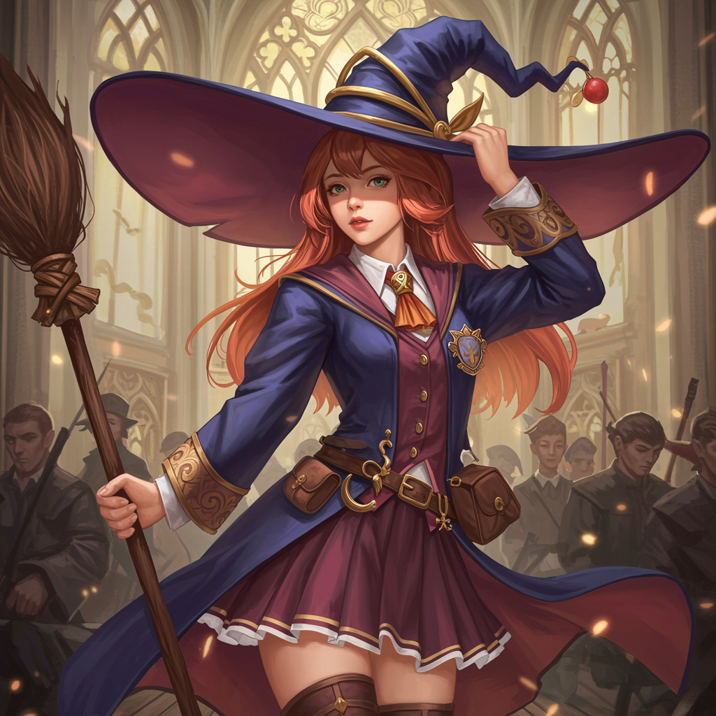 A fierce and enchanting young witch in an intricately designed magic academy uniform, adorned with a large, dramatically wide-brimmed witch hat. The scene is cinematic, capturing the essence of an elaborate and elegant masterpiece. This digital painting combines the styles of renowned artists, featuring concept art that merges the ethereal beauty of Alphonse Mucha with the dynamic energy of Artgerm and the imaginative depth of Ruan Jia, Hong Soonsang, WLOP, and Greg Rutkowski. The artwork is a trending sensation, reminiscent of the most captivating pieces on ArtStation and Pixiv, blending elements of fantasy with an aura of mystique that invites viewers into its spellbinding world.