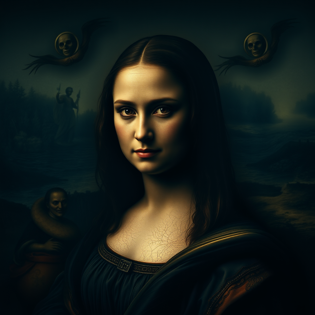 A fierce and enigmatic Mona Lisa reimagined under the gothic, dark direction of Tim Burton, captured in a realistic and cinematic style. Her intense gaze meets the camera, surrounded by an atmosphere of mysterious shadows and intricate details reminiscent of gothic horror. The scene is rich with dark hues and textures, highlighting an aura of power and intrigue, while maintaining an elongated aspect ratio for dramatic effect.