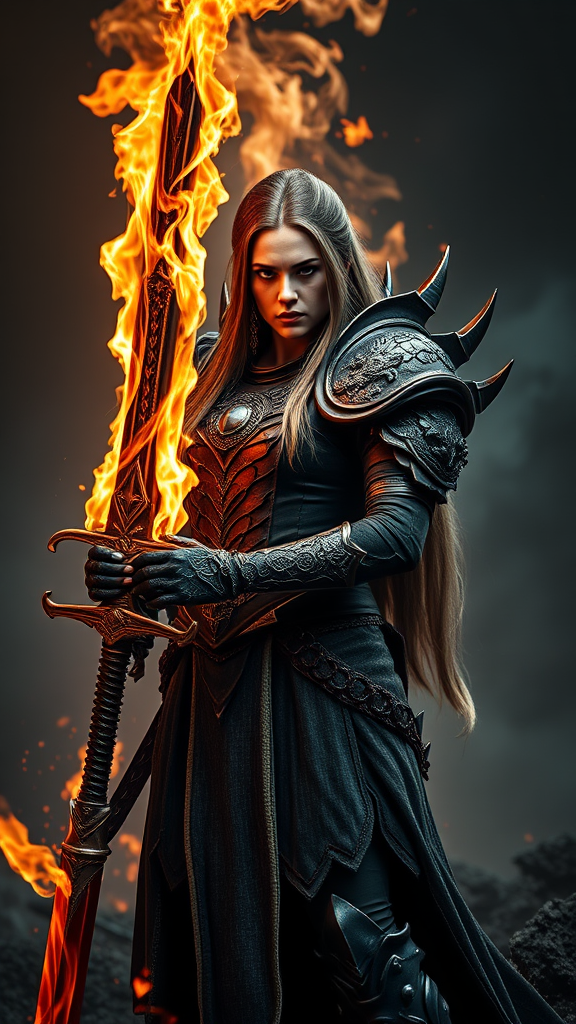 A fierce and realistic warrior woman clad in black, terrifying armor stands poised, gripping a flaming sword. Her human face is framed by long hair, exquisitely detailed, each feature sharp and revealing her formidable spirit. Her dragon-themed armor is crafted with intricate detailing, reflecting a combination of fearsome power and beauty. The scene captures a sense of awe with her epic, commanding pose against an evocative background of swirling fire and ash. The environment resonates with a haunting yet epic atmosphere, enhancing the horror aspect of the setting. Her presence is vividly captured in high resolution, bringing every aspect of this powerful character to life in a breathtaking, reality-defying display.