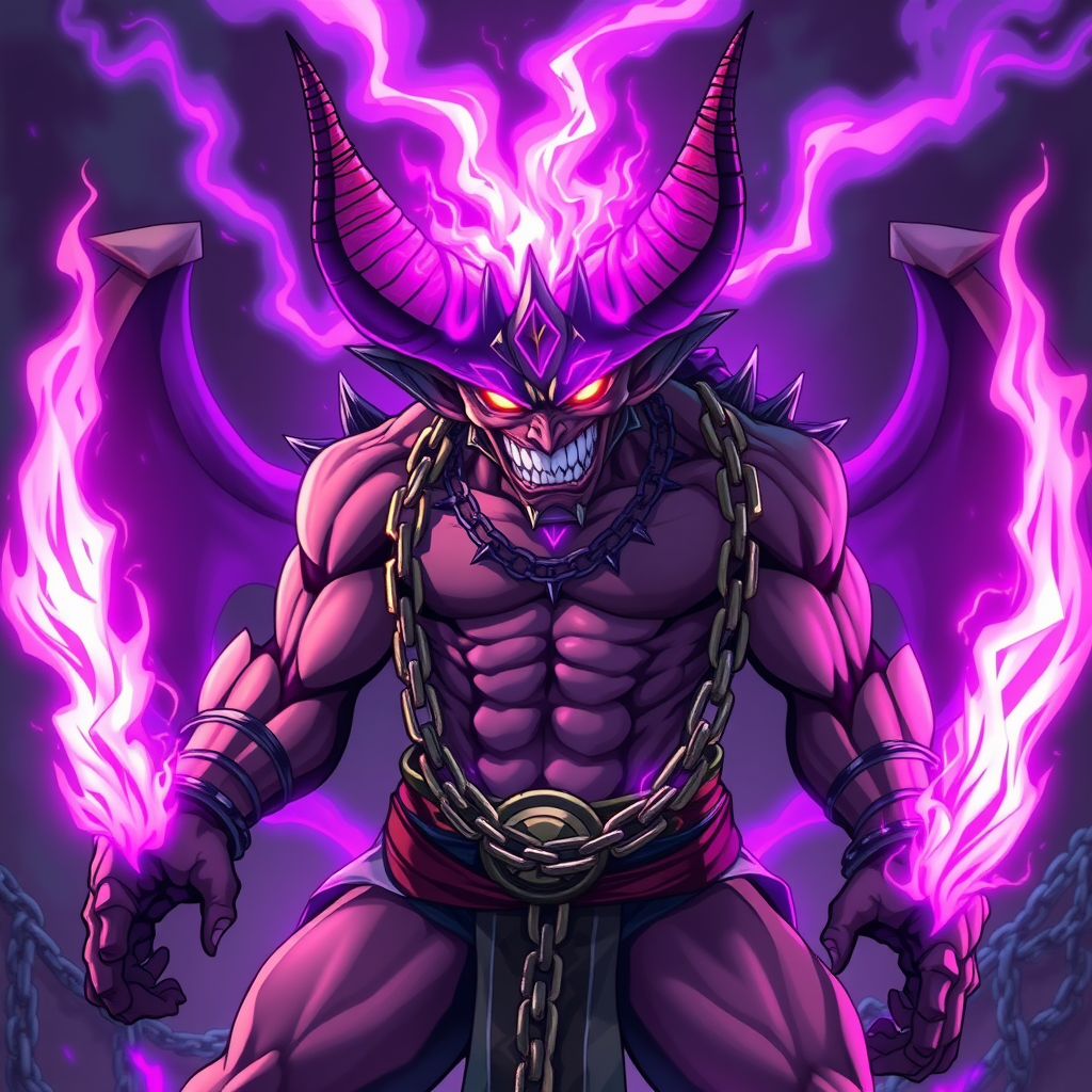 A fierce anime-style demon warrior stands poised for battle, sporting menacing horns and bound by intricate chains that pulse with power. His eyes burn with a fiery resolve as purple flames dance around him, casting an eerie glow on his muscular form. A vivid pink energy swirls around his head, crackling with intensity, as if manifesting his inner strength. The scene is rich in detail and color, set against a dramatic background that emphasizes his formidable presence.