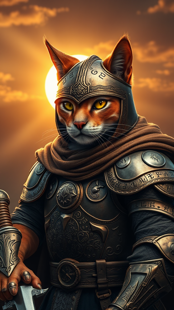 A fierce anthropomorphic feline champion clad in glistening armor, its helmet adorned with intricate engravings of ancient runes, stands poised for battle. The setting sun casts dramatic rays of light, illuminating the cat warrior's determined gaze and accentuating the exquisite detail of its battle-worn attire. The warrior's cape billows dramatically in the wind, hinting at tales of past victories and noble quests. Inspired by classic legends, this captivating portrait captures the essence of a fearless protector, with a background that speaks to the warrior's mystic and mystical heritage, deserving of admiration in any art gallery or collection.
