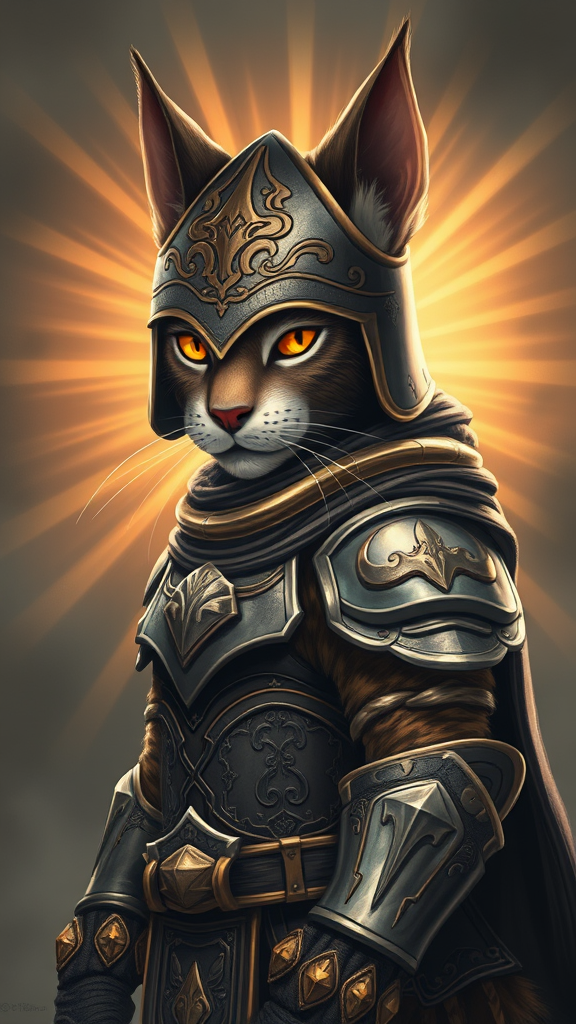 A fierce anthropomorphic feline knight adorned with a ornate helmet, standing confidently in a portrait design study, illuminated from behind with radiant light beams, intricately detailed fur and armor glistening, capturing a sense of strength and nobility in a style highly popular on art platforms.