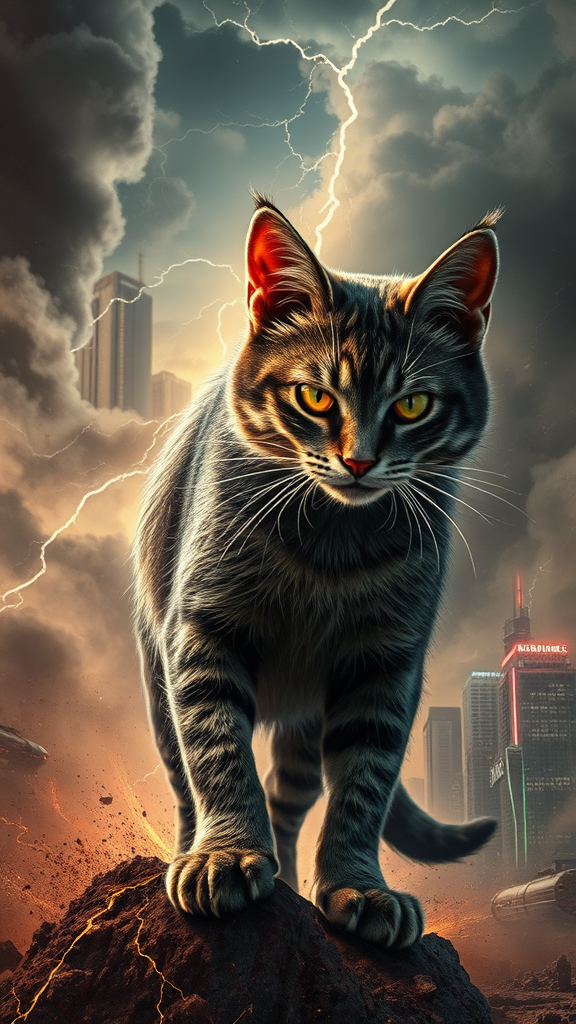 A fierce, badass feline with mesmerizing eyes stands amidst a swirling storm, its fur bristling with static. This angry cat, a symbol of rebellion, prowls through a dust-laden, dystopian megacity, its towering skyscrapers and neon lights glowering in stark contrast against a tumultuous sky. Sparks and lightning crackle around it, painting an intricate and electrifying tableau of sci-fi cyberpunk chaos. In this apocalyptic setting, every detail is captured in stunning 4K resolution, creating an image that feels like a scene from an epic movie poster.