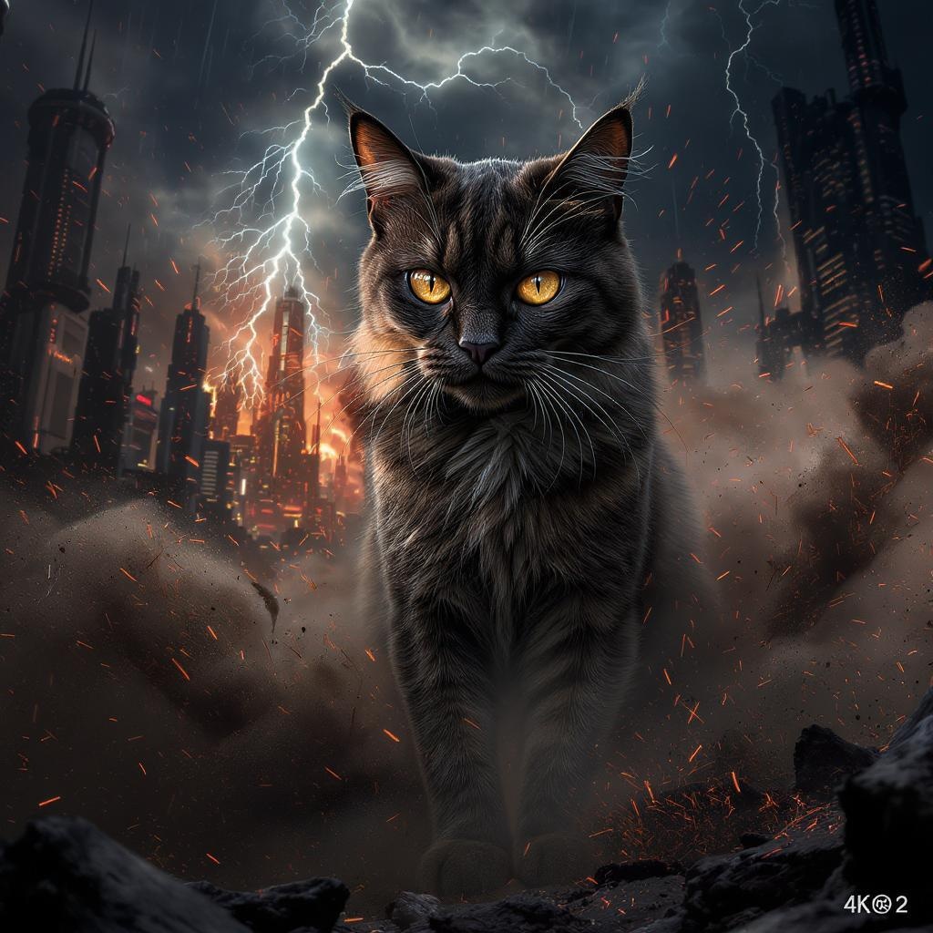 A fierce, badass feline with mesmerizing eyes stands defiantly amidst a swirling storm of dust and sparks, set against the backdrop of a futuristic, apocalyptic cityscape. The cyberpunk skyline looms with lightning illuminating its intricate architecture, adding a sense of tension and drama. The cat's sleek form and intense gaze suggest a creature not just of animal instinct but of mysterious intelligence, hinting at a deeper connection to this world. The scene is captured in stunning 4K detail, evoking the visual intensity of a cinematic movie poster.