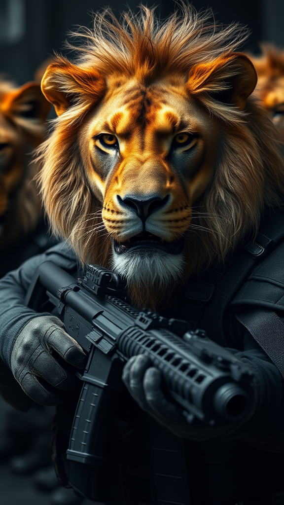 A fierce, battle-hardened lion army sporting sleek tactical black ops uniforms, gripping advanced carbines, exhibiting an anthropomorphic form with intricate and realistic detail, ultra HD 8k quality with maximum facial expressions, illuminated by dramatic cinematic lighting, full of intensity and drama, aspect ratio 9:16, emphasis on the lion's defiant and powerful stance.