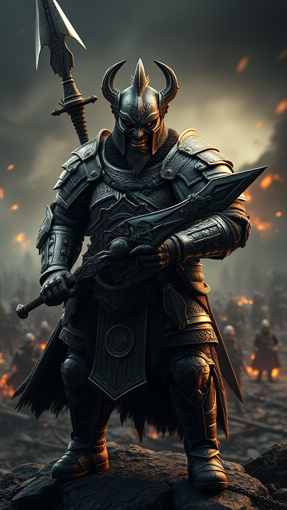 A fierce, battle-hardened warrior with a sinister grin clad in intricately detailed armor, wielding an elaborately designed weapon. The scene is set with dark, moody tones, capturing the essence of an intense battlefield in the background. The warrior stands in a commanding militant pose, exuding an aura of raw power. This portrayal emphasizes an epic composition with dramatic shadows, styled in the latest trend from ArtStation. It's designed as a high-resolution 8k wallpaper, rendered in Octane with realistic cinematic lighting, showcasing an isometric view. Created using Blender, it features stunning VFX elements that enhance its cinematic appeal.