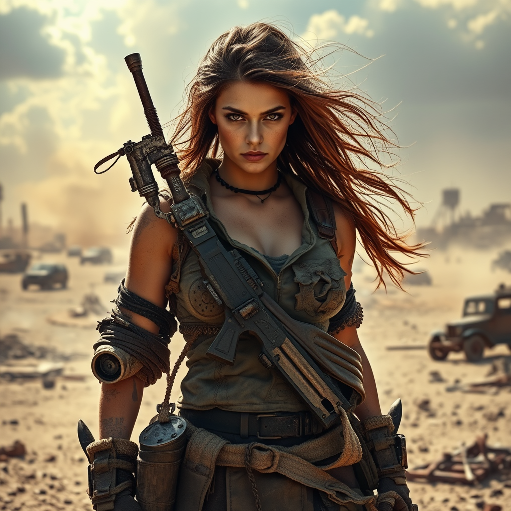 A fierce, battle-hardened woman stands amidst a desolate wasteland, her rugged attire crafted from scavenged materials, radiating strength and determination. Her piercing eyes focus on the horizon, framed by wind-swept hair, as a dust storm brews in the background. The remnants of a collapsed city loom distantly, with rusted vehicles and twisted metal scattered around, telling the tale of past chaos. Her armaments, a mix of improvised weapons and high-tech relics, hint at survival skills honed in a harsh post-apocalyptic world. Sunlight breaks through the ominous clouds, casting dramatic shadows and highlighting her as a beacon of hope in this gritty landscape.