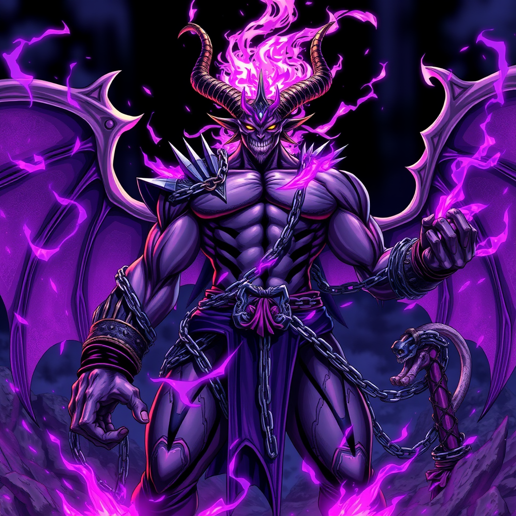 A fierce demon warrior stands tall, wielding chains wrapped around their muscular arms, their sharp horns gleaming in the ambient light. Purple flames dance menacingly around their body, while vibrant pink energy swirls and pulses around their head, casting an eerie glow. The scene is depicted in striking anime, manga style, with an emphasis on intricate details and dynamic motion, set against a dramatic backdrop that enhances the otherworldly atmosphere.