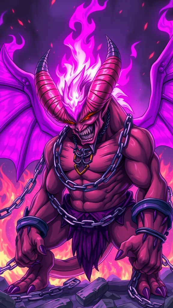 A fierce demon warrior with curling horns stands ready for battle, enveloped in vibrant purple fire that crackles with intensity. Chains wrap around its muscular form, rattling with each movement. A shimmering aura of pink energy pulsates around its head, illuminating its sharp features. The setting is rendered in a dynamic anime, manga style, with intricate details highlighting the texture of the demon's skin and the flames dancing in the background.