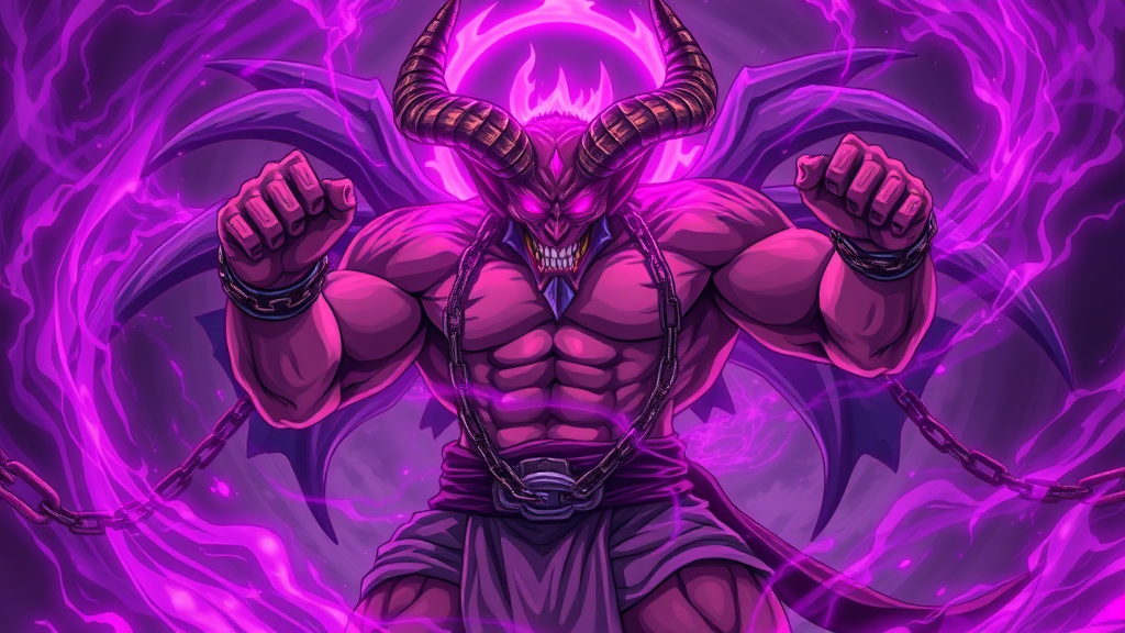 A fierce demon warrior with imposing horns stands confidently, engulfed in a swirling maelstrom of purple fire. Chains with ethereal glow wrap around its muscular arms, hinting at both power and restraint. Vibrant pink energy emanates in a halo-like aura surrounding its head, crackling with potential. The scene bursts with anime and manga-style intricacies, capturing the dynamic movement and powerful presence of this otherworldly fighter, all set against a dramatic 16:9 background.