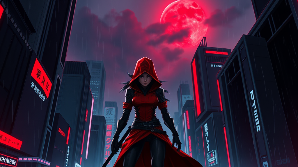 A fierce female assassin ninja clad in a sleek red and black outfit prowls through a futuristic cityscape, her silhouette blending seamlessly with the shadows of towering black and red structures. Under a dark, fog-laden sky, the neon glow of cyberpunk aesthetics casts an eerie fluorescent light, illuminating the scene with dynamic bursts of color. Above, a crimson-red moon peers through blood-red clouds, casting an ominous, otherworldly glow over the urban landscape. Rain falls steadily, creating a rhythmic patter against the sleek surfaces, while the atmosphere is charged with a sense of impending danger. The setting embodies an anime-inspired fusion of traditional stealth and modern technology, where the line between reality and illusion blurs in this hybrid world.