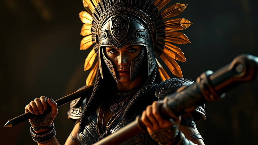A fierce female Aztec warrior stands in a cinematic pose, her full battle face mask and helm crafted with exquisite detail, glistening under dramatic lighting. Her finely detailed armor shimmers with intricate designs, telling stories of ancient battles. She wields an obsidian-edged club with formidable presence. The scene is captured with ultra-realistic, movie-quality rendering, showcasing a photorealistic, emotional portrayal. Her focused gaze pierces through the cinematic atmosphere, illuminated by epic, dramatic lighting. The waist-length body shot captures the essence of power and grace, rendered in the highest detail quality with an ultra-detailed, dark kingcore aesthetic in 32k UHD resolution.