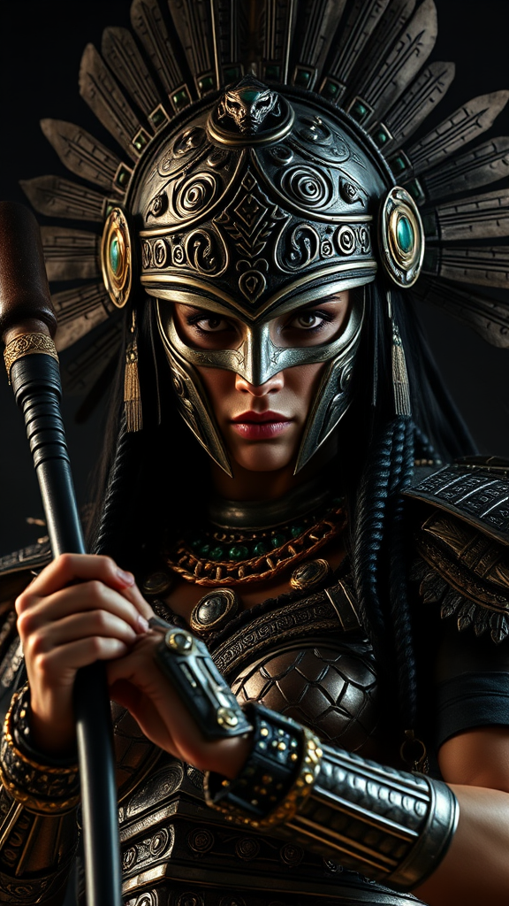 A fierce female Aztec warrior stands poised and powerful, her striking face hidden behind an ornate battle mask intricately etched with symbols of her lineage. Her helm glimmers with jade and gold accents, melding seamlessly into her finely detailed armor that clings to her form with an elegance that belies its strength. In her grip, she wields an obsidian-edged club, its surface catching the cinematic lighting in sharp contrasts. Every inch of her gear is adorned with patterns and designs steeped in heritage, capturing an ultra-realistic, photorealistic quality with a dark, regal aura reminiscent of a kingcore aesthetic. The scene is captured in dramatic, epic lighting that highlights her determined, focused expression, embodying both grace and ferocity. The image is rendered with astonishing detail, a true movie-quality composition, in 32k UHD resolution, framed in a dynamic 9:16 aspect ratio, exuding emotion and intensity while maintaining the soul of the original vision.