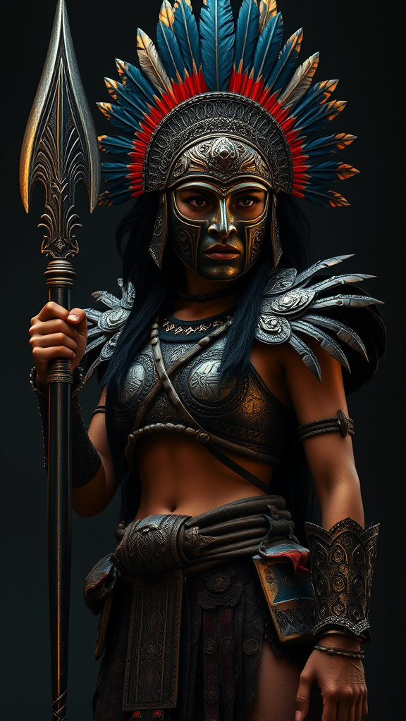 A fierce female Aztec warrior stands poised, her presence commanding attention. She wears a masterfully crafted battle face mask adorned with intricate carvings that tell stories of her lineage. Her helm is decorated with vibrant feathers symbolizing strength and honor. Her armor is a masterpiece of artisanal detail, each piece meticulously designed with ancient patterns that reflect her warrior spirit. In her hand, she wields an imposing club with razor-sharp obsidian edges, gleaming ominously under the light. The scene is captured with ultra-realistic clarity, employing dramatic cinematic lighting that highlights her focused and intense expression. This photorealistic rendition showcases an epic moment, capturing the essence of power and emotion in a movie-quality rendering, reminiscent of a dark kingcore aesthetic. The warrior is depicted in a waist-length shot, her form majestic against a backdrop of shadow and light. The intricacy and detail are evident in this 32k UHD resolution image, offering a breathtaking glimpse into the world of ancient warriors.