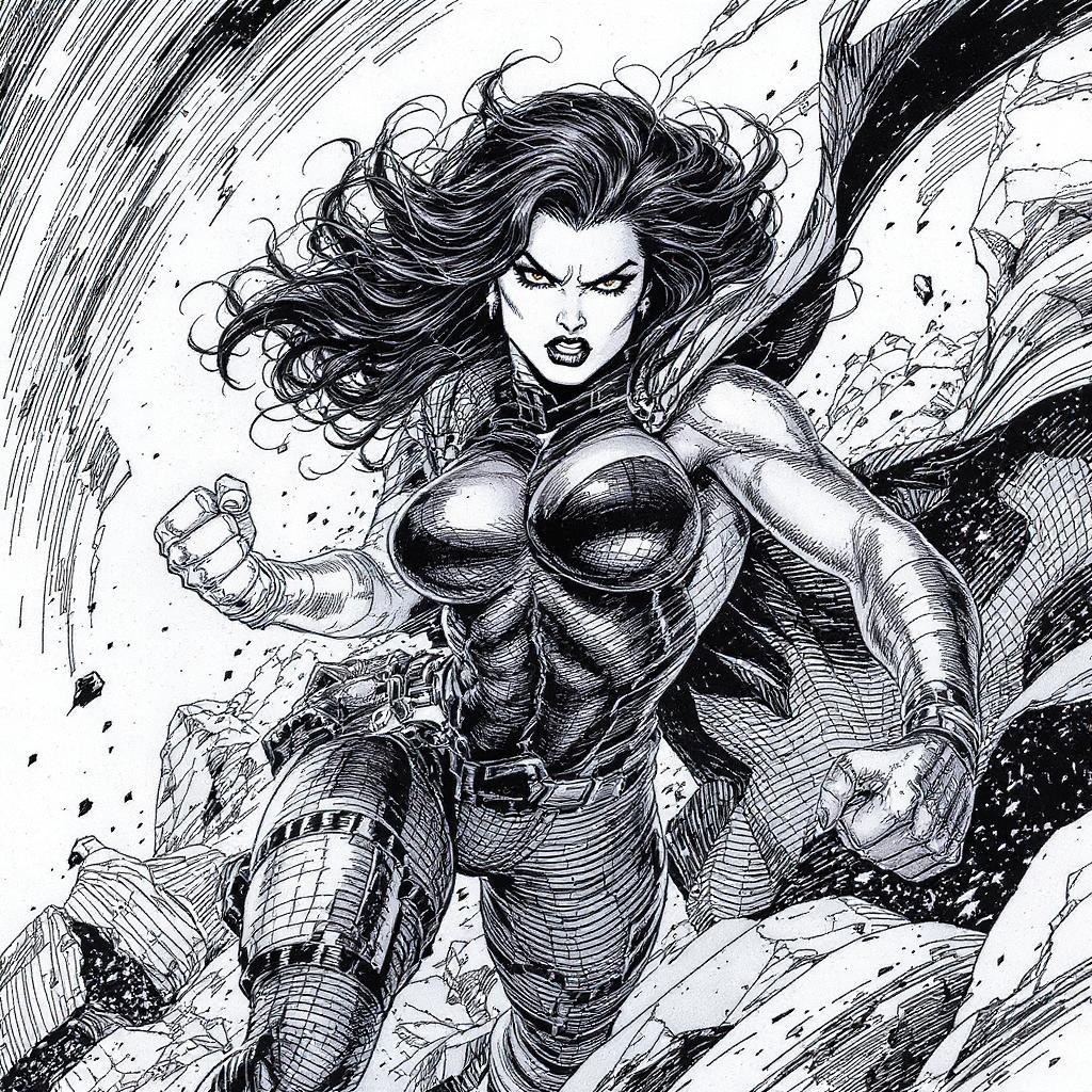 A fierce female character in the style of 90s Top Cow comics, striking a dynamic pose in an intense action scene. The image features inked line art with ultra-detailed elements, including intricate shadows and high-contrast lighting that highlights her athletic physique. Her costume is elaborately designed, showcasing textures and patterns typical of the era. She exudes power and determination, with flowing hair and a confident expression, set against a backdrop that complements her dynamic stance. The overall image is a high-resolution, comic book illustration that captures the intense energy and dramatic aesthetic of 90s comic art.