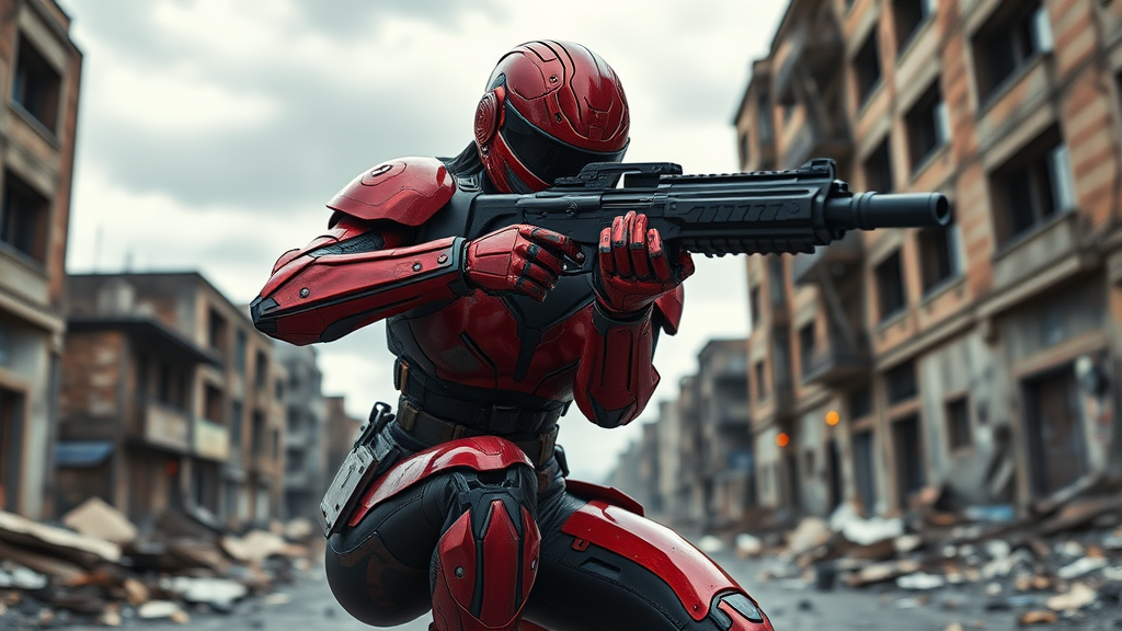 A fierce female figure with red cybernetic arms clad in intricate sci-fi battle armor takes a knee, aiming her weapon decisively. Her helmet, brimming with a high-tech visor and a sleek mask, reveals a bald head hinting at her cybernetic integration. Clad in detailed plate armor resembling a futuristic spacesuit, she commands attention with precision. In a ruined city street under an overcast sky, the scene unfolds with natural textures and superb photorealism. The cinematic rendering capitalizes on ray tracing to emphasize detail. Set at the highest quality and detail in 8K Ultra-HD, the mood is enhanced by natural and moody lighting akin to a sci-fi movie. A third-person view captures the scene, with intentional blur effects and long exposure to add depth, encapsulating a sense of urgency and isolation.