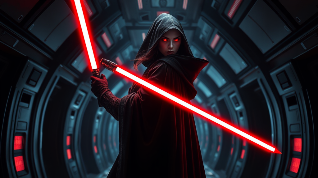 A fierce female Sith lord with glowing crimson eyes grips a pulsating red lightsaber in her right hand, angled ominously at 45 degrees. Draped in a shadowy black cloak, she stands defiantly, her silhouette a commanding presence in the dimly lit hallway of a dark, metallic spaceship. Her posture radiates fury, her back turned to the camera, exuding an aura of power and menace.