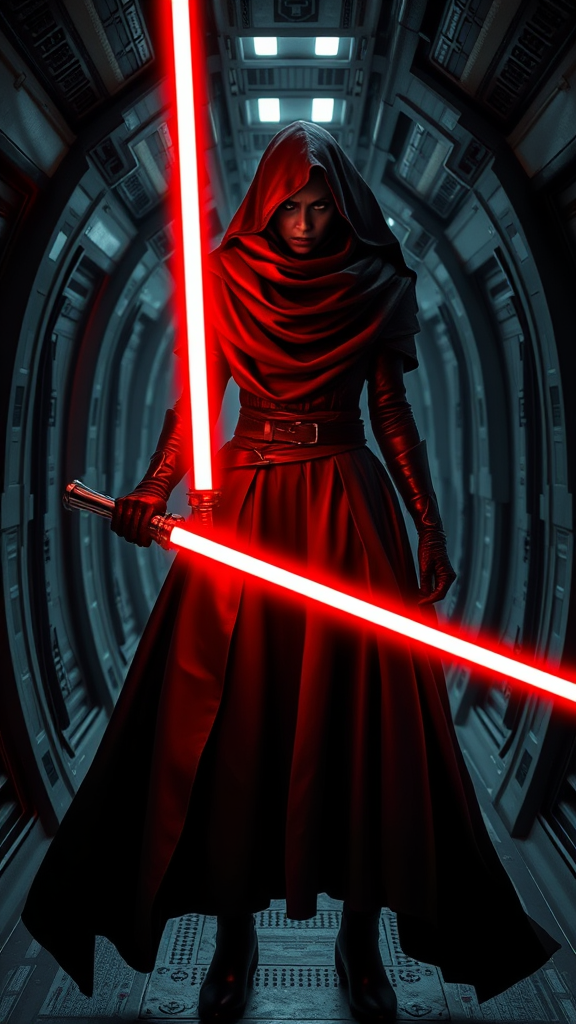 A fierce female Sith Lord with glowing red eyes stands menacingly in a dark spaceship hallway. Her black cloak billows around her as she holds a red lightsaber in her right hand, extended at a 45-degree angle. With her back to the camera, her full body is visible, radiating anger and power. Subtle shadows dance across the alloy walls, highlighting the tension in the dimly lit corridor, while the hum of the lightsaber echoes in the ominous silence.