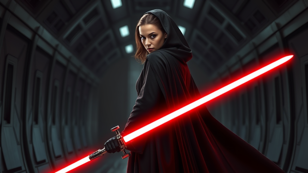 A fierce female Sith lord with piercing red eyes grips a glowing crimson lightsaber in her right hand, holding it confidently at a slight diagonal angle. Clad in a flowing black cloak that enhances her commanding presence, she stands defiantly in a dark, imposing spaceship corridor. Her back is turned towards the viewer, her stance suggesting a simmering, barely-contained rage. The dim, metallic hallway provides a stark backdrop, echoing with the silent intensity of impending conflict. Subtle shadows play across the smooth surfaces, highlighting the Sith lord's powerful silhouette.