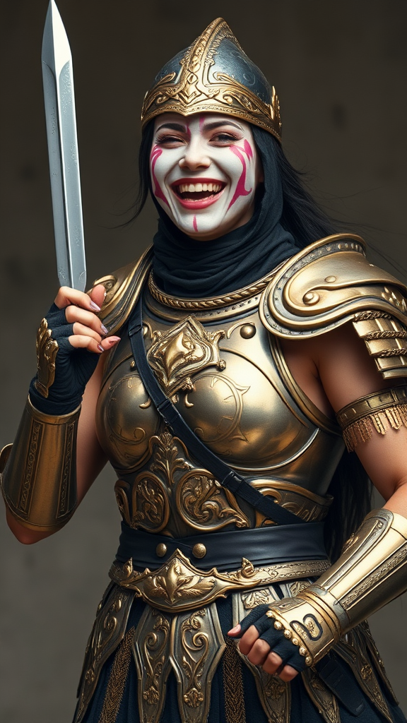 A fierce female warrior adorned in realistic, intricately designed golden and silver European armor stands confidently, her strong arms uncovered and displaying their strength. She wields a gleaming knife, exuding a sense of readiness and power. Her face is painted with whimsical pink and white mime patterns, adding an artful and enchanting contrast to her formidable presence. She is smiling broadly, her laughter resonating with a captivating blend of joy and strength, creating a striking and dynamic visual.