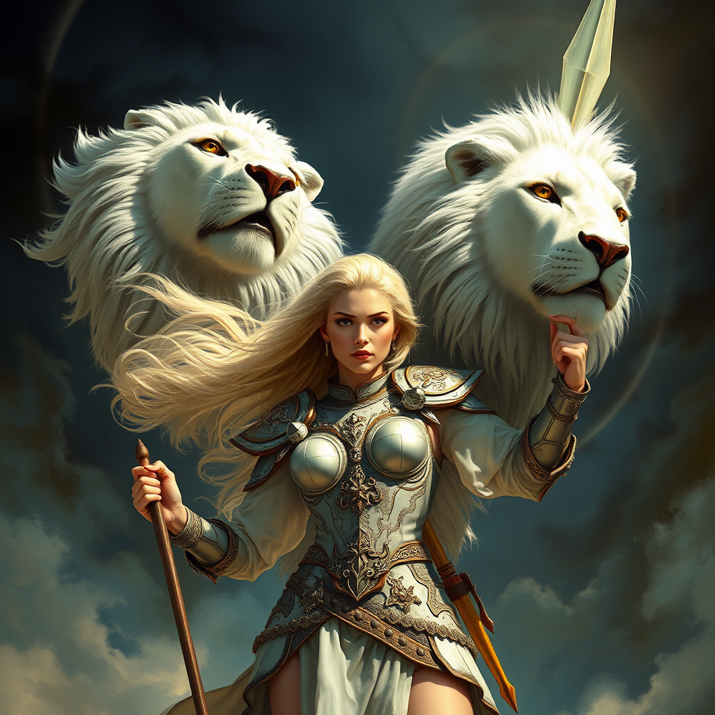 A fierce female warrior standing triumphantly, clad in ornate, ethereal armor, her flowing hair caught in a celestial breeze. She holds aloft a spear, its tip piercing the sky, with the majestic head of a gargantuan white lion impaled upon it. The lion's eyes, still and profound, reflect an ethereal inner light. Her own eyes are sharp and determined, capturing an unyielding spirit. The scene is awash in dynamic lighting, casting dramatic shadows and highlighting the intricate details of her armor and the lion's mane. The background is a swirling dreamscape reminiscent of Peter Mohrbacher's otherworldly style, enhancing the mythical and heroic essence of the tableau.