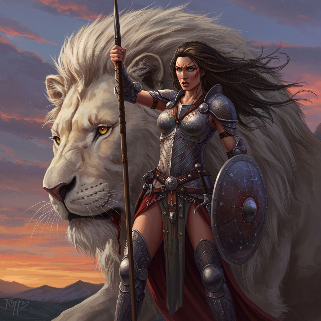 A fierce female warrior stands triumphant, her long hair flowing in the wind, as she holds the head of a colossal white lion impaled on her spear, fierce determination in her eyes. The lion's face exudes a regal yet feral majesty, its eyes open, reflecting a serene surrender. She is depicted in the ethereal, otherworldly style reminiscent of Peter Mohrbacher, with intricate patterns etched into her armor, reminiscent of celestial constellations. The scene is bathed in dynamic lighting, casting dramatic shadows and illuminating the intricate details of her battle gear and the lion's majestic mane. Her stance is powerful and commanding, set against a twilight sky, evoking a sense of ancient myth and epic conquest.