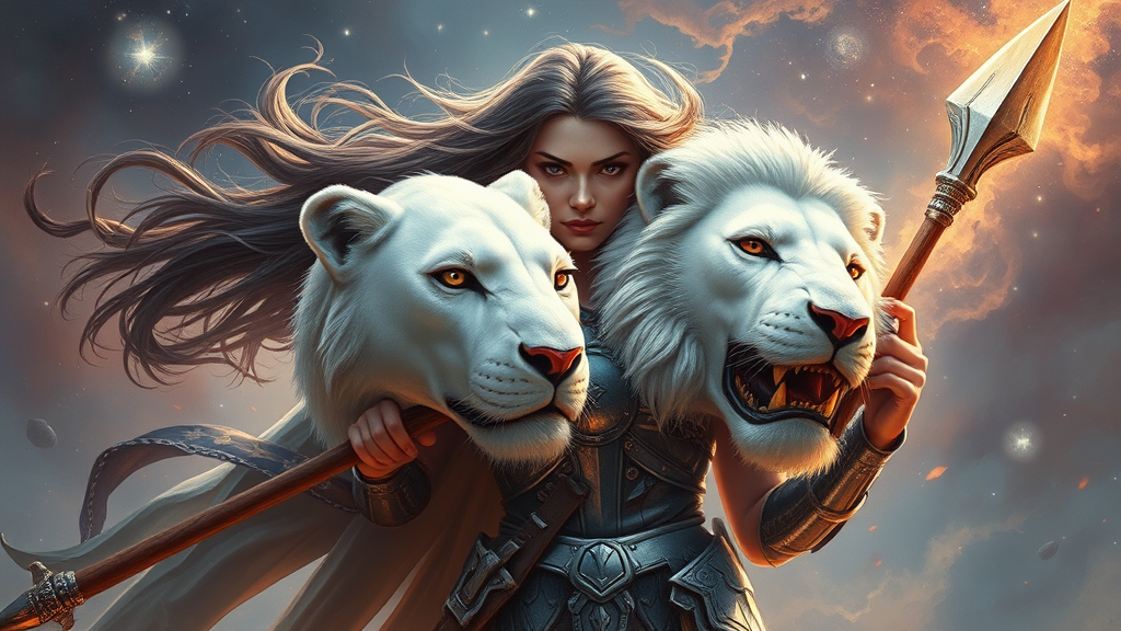A fierce female warrior stands triumphantly, her armor gleaming under dynamic, ethereal lighting. Her strong, determined gaze is fixed ahead, a testament to her victorious conquest. She grips a spear with the head of an enormous white lion impaled on its tip, its eyes hauntingly expressive and detailed, evoking a sense of majestic power. The scene is imbued with an otherworldly aura, akin to the style of Peter Mohrbacher, where the backdrop swirls with celestial colors. Her long hair flows like a cascade of dark silk, accentuating her fierce presence, as the lion's ethereal, white mane contrasts sharply against the scene's rich, dreamlike palette.