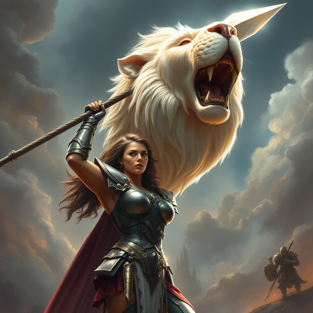 A fierce female warrior stands triumphantly, her eyes sharp and determined, as she holds aloft a massive spear with the severed head of a colossal alabaster lion impaled upon it. The lion's majestic features are frozen in a snarl, its fur luminescent under dynamic, shifting lights that cascade over the scene. The warrior's armor glints with iridescent hues, complementing the ethereal glow of the lion's mane. Her stance exudes power and grace, reminiscent of a mythical guardian from a dreamscape. The backdrop hints at a surreal and otherworldly battle, where shadows and light dance vividly in a style inspired by Peter Mohrbacher, capturing the essence of a celestial confrontation.