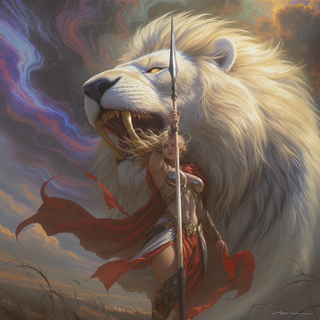 A fierce female warrior stands triumphantly, her spear piercing through the severed head of a colossal white lion, its majestic mane cascading down. Her face is intricately detailed, with piercing eyes that convey strength and determination. Dynamic lighting casts dramatic shadows, highlighting her armor and the lion's features, as if capturing a moment frozen in time. The setting is an otherworldly landscape, reminiscent of Peter Mohrbacher's dreamlike realms, with swirling, ethereal colors and a sky that blends into a canvas of vibrant hues.