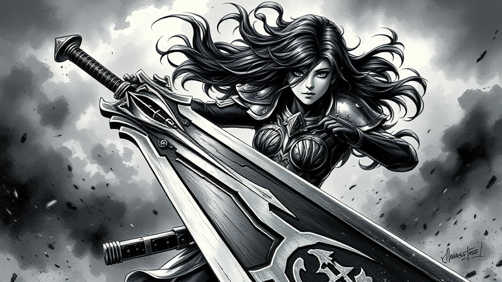 A fierce female warrior wielding a massive greatsword, rendered in a dramatic final fantasy ink style with intense lighting, captured in a wide-angle view, showcasing intricate armor details, flowing hair, and a stormy sky backdrop, high resolution, aspect ratio 3:2, emphasizing her strength and determination.