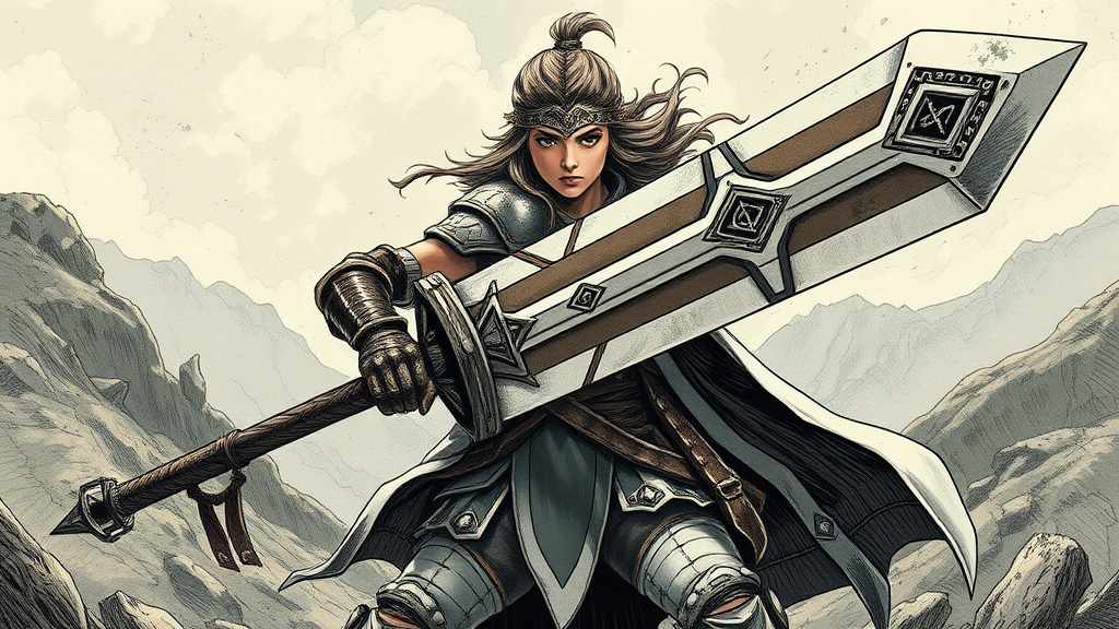 A fierce female warrior wielding an enormous greatsword, depicted in an inked style reminiscent of classic RPG art, stands poised for battle; her intricate armor catches the dramatic lighting, casting sharp shadows against the textured landscape; the wide-angle view captures the vastness of her surroundings in stunning detail, presenting an epic scene rendered in ultra-high definition, emphasizing her strength and determination within the expansive 3:2 frame.