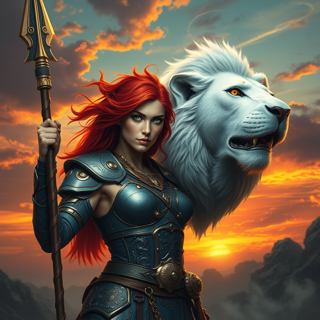 A fierce female warrior with fiery red hair stands triumphant in a mythical landscape, her armor intricately detailed with celestial motifs. She holds aloft a majestic spear from which the head of a colossal white lion, adorned with regal gold markings, hangs defiantly. Her piercing emerald eyes reflect both determination and wisdom, while the lion's eyes, even in defeat, retain an enigmatic luminescence. The scene is bathed in dynamic lighting, casting dramatic shadows and highlighting the powerful synergy between hunter and hunted. The background features ethereal wisps of clouds in a fiery sunset sky, enhancing the epic and otherworldly atmosphere, reminiscent of Peter Mohrbacher's ethereal style.