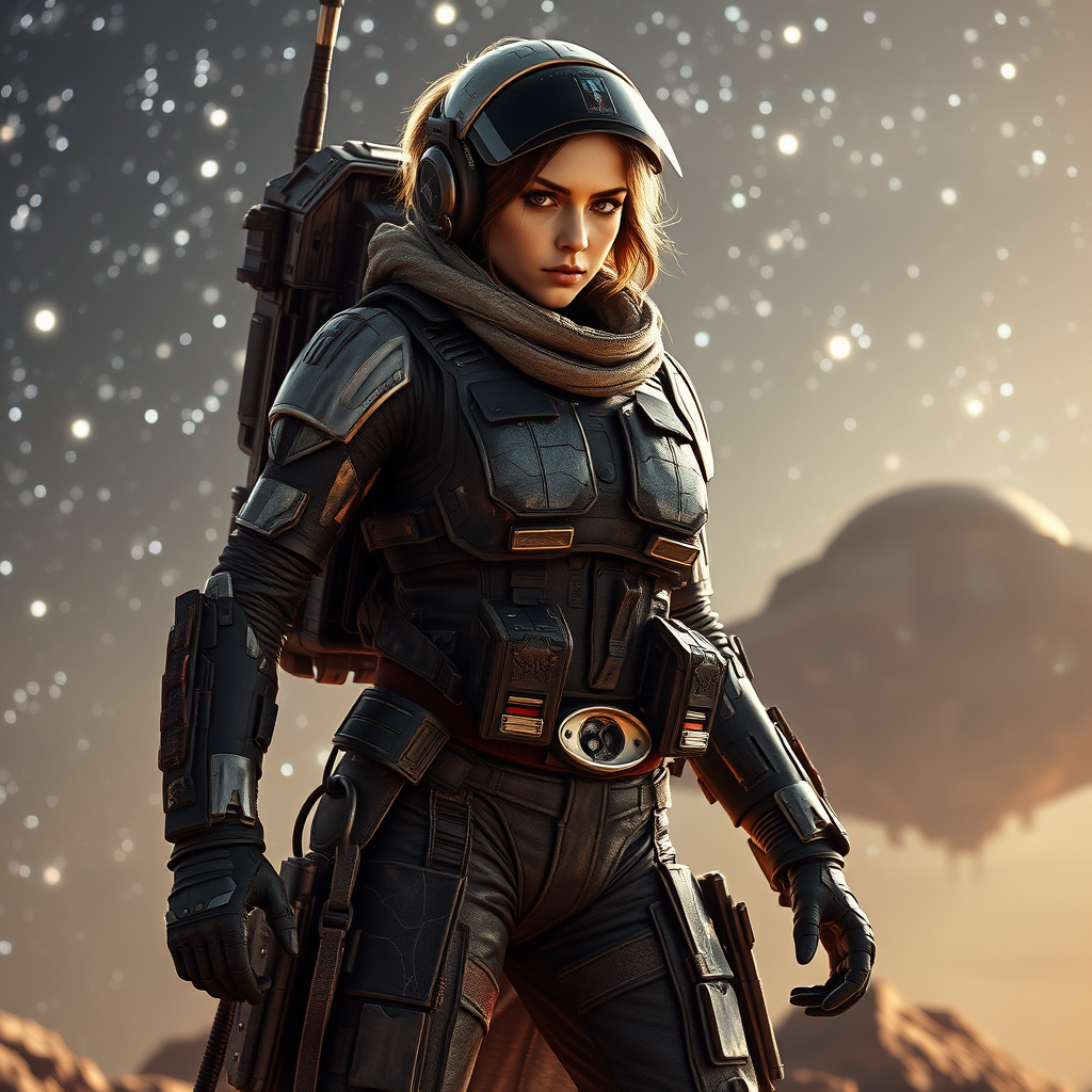 A fierce female x-wing pilot stands poised, her space suit intricately designed with armored layers and rugged boots, exuding a warcore aesthetic. Cinematic lighting casts dramatic shadows on her face, highlighting her determined expression and futuristic visor. The hyper-realistic scene features a grainy texture, emphasizing the gritty nature of her epic fantasy world. Her appearance combines harsh, sharp features with refined details, capturing a graphic intensity that evokes a sense of uncompromising strength and resolve, all rendered in stunning 8k resolution against the backdrop of a vast, star-speckled galaxy.