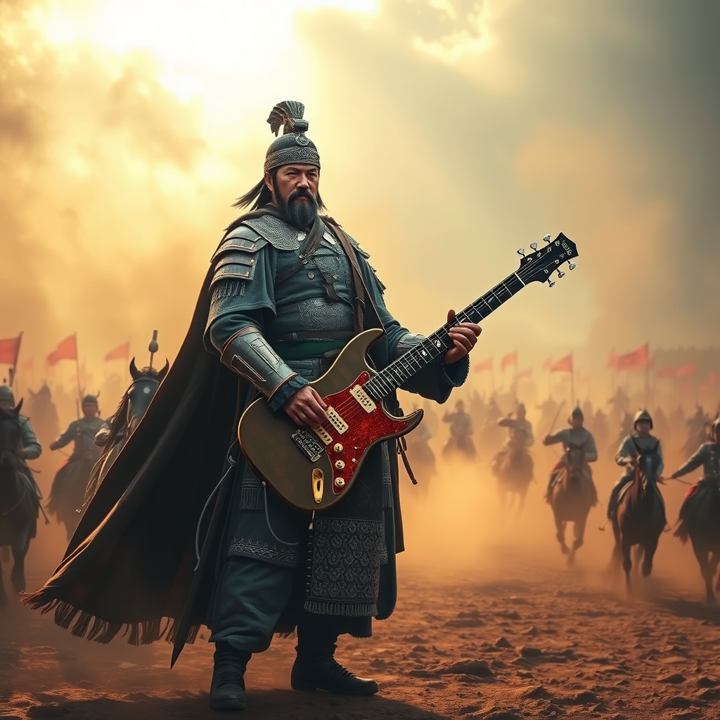A fierce general of the Qin Dynasty stands tall on a vast battlefield, gripping an electric guitar. The air is thick with dust and smoke, and the ground trembles with the charge of an army of horses in the background. The scene is captured in a panoramic, hyper-realistic portrait, where the contrast of ancient armor and modern instrument melds history and fantasy. Sunlight breaks through the haze, casting dramatic shadows across the determined face of the general, as the cacophony of battle mixes with imagined, electrifying riffs.