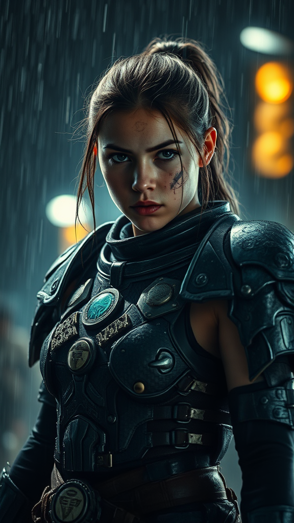 A fierce girl adorned in futuristic, battle-worn armor stands poised under the haunting glow of a dark, rainy night, embodying the essence of an epic fight scene. Her face, intricately detailed and marked by the intensity of battle, reveals wounds that tell a story of survival and resilience. As cinematic lighting bathes her in a hyperrealistic glow, the environment around her transforms into a stunning masterpiece of atmospheric chaos and beauty. Lumen reflections dance on slick surfaces, capturing the intense focus of the scene and crafting a breathtaking, detailed portrait of a warrior amidst a storm.