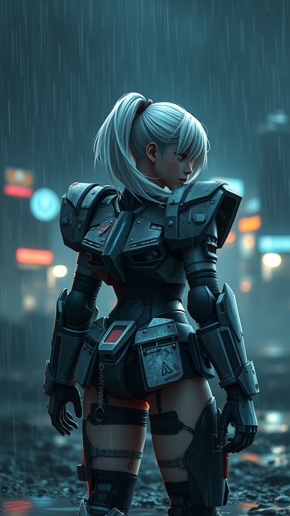 A fierce girl clad in battle-damaged Gundam armor stands amidst a dark, rainy night, her white hair pulled back in a sleek ponytail. Positioned within an epic fight scene, she bravely endures the aftermath of a fierce battle. Her environment is styled in the distinctively vivid and expressive manner of Borderlands, trending on ArtStation for its extreme detail and cinematic mastery. The scene is captured with a photography-like precision, revealing a stunning, surreal landscape with shining surfaces and smooth, celestial ambiance. The aesthetic combines manga and anime influences, with an atmosphere so intricate and vibrant it feels hyperrealistic. Lit with striking cinematic lighting, the scene is focused and alive with color, crafted using Unreal Engine 5 with lifelike lumen reflections in CGI. Rendered in 3D with an almost doll-like perfection, the composition is flawless, avoiding common visual errors such as low quality, errors in anatomy, or deformations, resulting in an artistic masterpiece of divine proportions.
