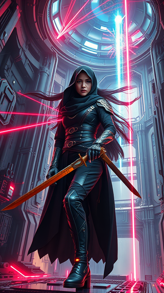 A fierce hijabi warrior with sleek cyberpunk prosthetics stands confidently, gripping a gleaming katana, her traditional Islamic attire blending seamlessly with cutting-edge technology. Her long hair flows as she navigates the towering interior of a futuristic spaceship, adorned with intricate details that mirror the complexities of a sci-fi world. A pulsating laser ignites from the core, casting vibrant beams across the space, while another laser descends from the sky, creating dynamic energy vortices around her. The scene is captured in photorealistic detail, with rich textures and vivid colors that bring hyper-realism to life. The essence of speed and momentum is conveyed through a cinematic long exposure, capturing streaks of accelerated light, while the entire setting is rendered in stunning 8K super-resolution, inviting viewers into a world where tradition meets the future in an explosive display of artistry.