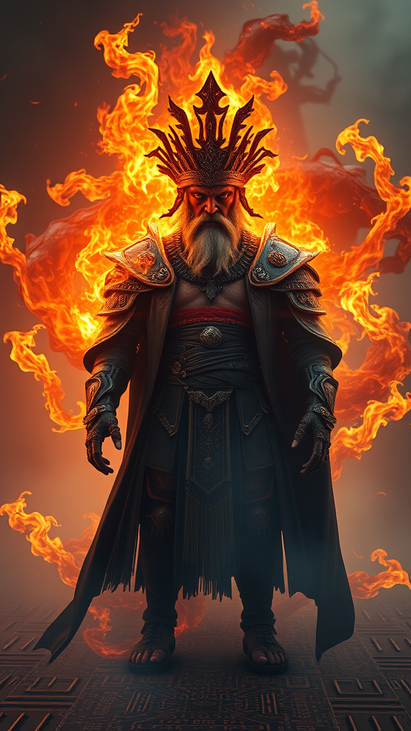 A fierce king of flames dominates the scene, surrounded by spiraling fire, shrouded in thick fog and mist. His face is chiseled to perfection, exuding power and regality, captured in lifelike detail. The king stands with a commanding presence on a ground resembling a circuit board, clad in elaborate, intricately designed attire that combines elements of both fantasy and tribal aesthetics. This illustration, suited for ArtStation, embodies a hyper-maximalist approach, rich in complexity and cinematic depth. The dark fantasy atmosphere is emphasized by an ultra-detailed 3D Octane render, showcasing photorealistic concept art in sharp focus. The composition is perfectly balanced, with intense shadows and lighting, creating a dramatic wallpaper in HDR, offering high-quality, high-definition imagery in an 8k resolution.
