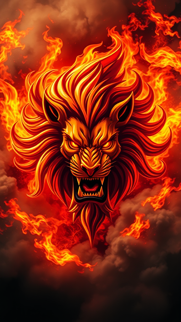 A fierce lion warrior emblem emerges, surrounded by swirling flames and thick smoke, its eyes burning with an intense fury, mane ablaze and flowing like a river of fire, embodying unrelenting rage and primal strength.
